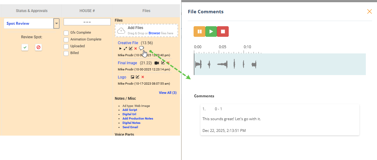Media can be played and paused. Comments posted will have a timestamp included for very clear communication of the "when" not just "what" the client has to say.