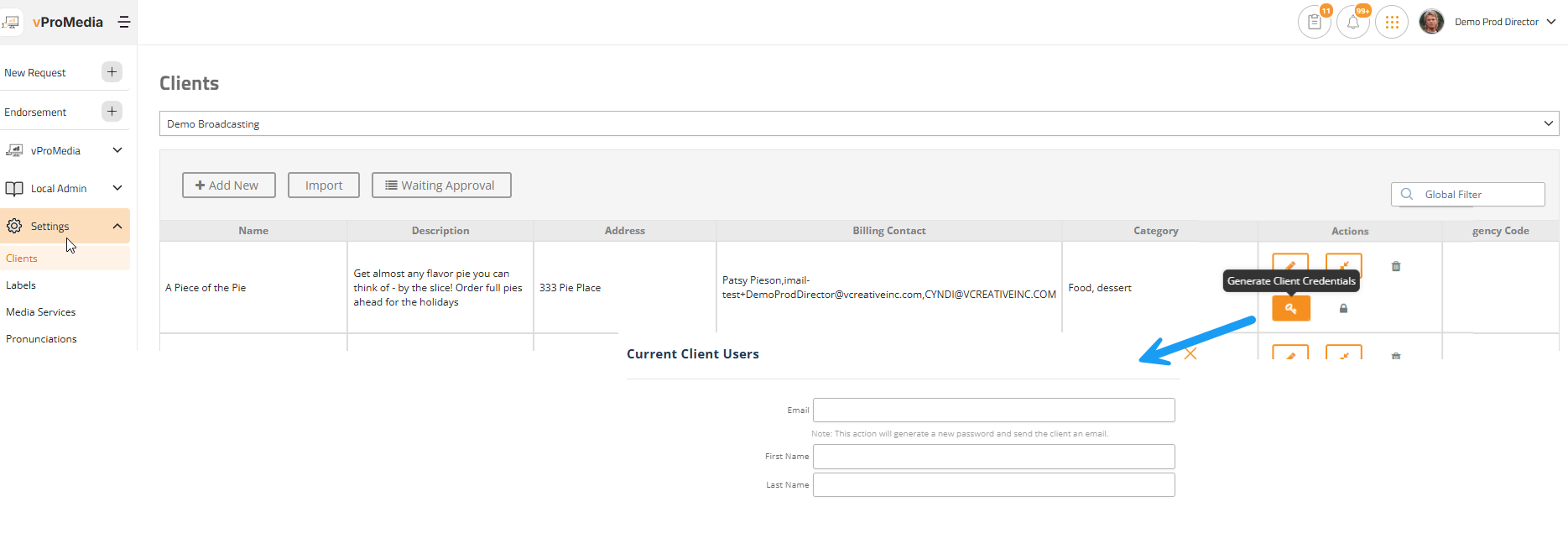 The “Key” icon is where you create the credentials, simply using an email address and first and last name. That sends an email with a link to the login page for that advertiser. When logged in, they will only be able to see the requests shared with them based on the “Access Settings” for that advertiser. You may want to establish the client’s “Access Settings” before creating the accounts.