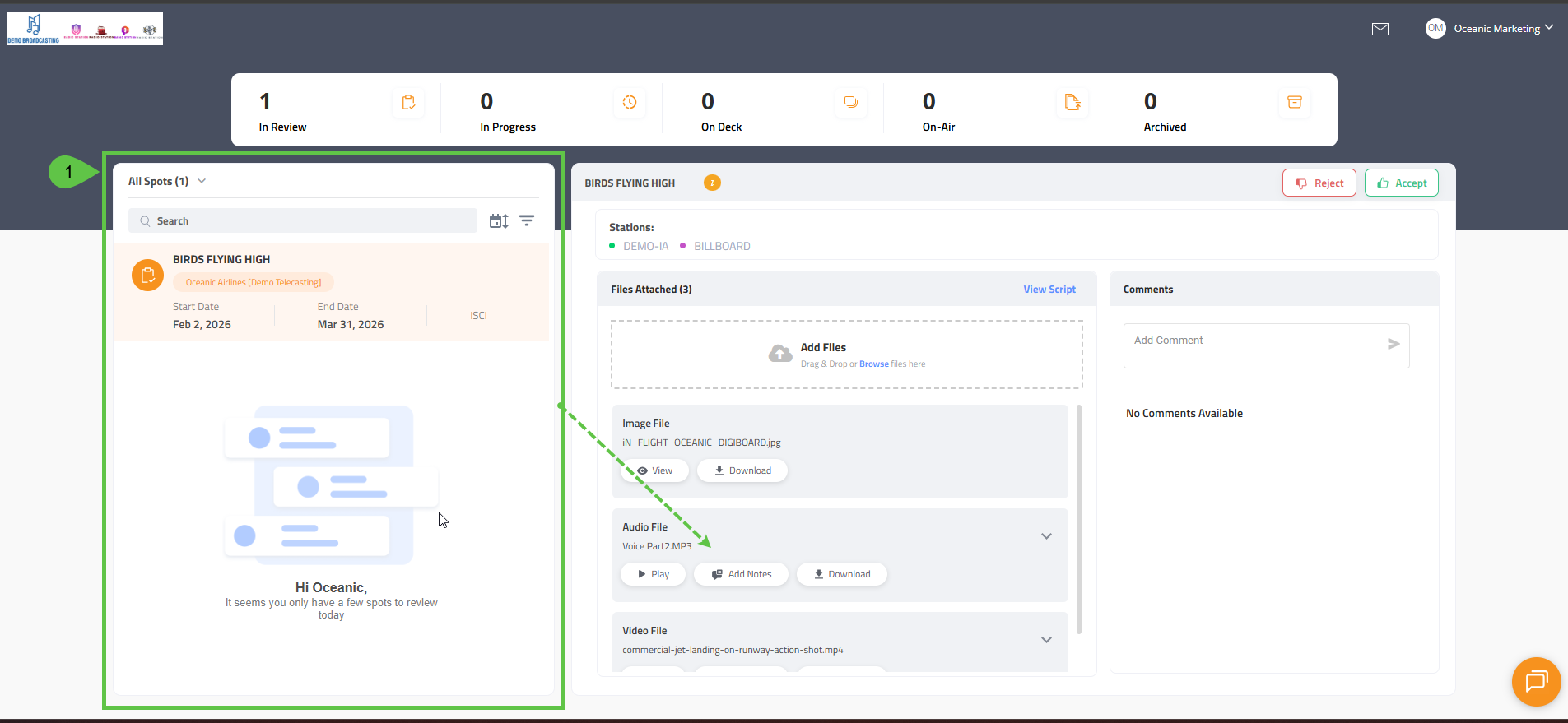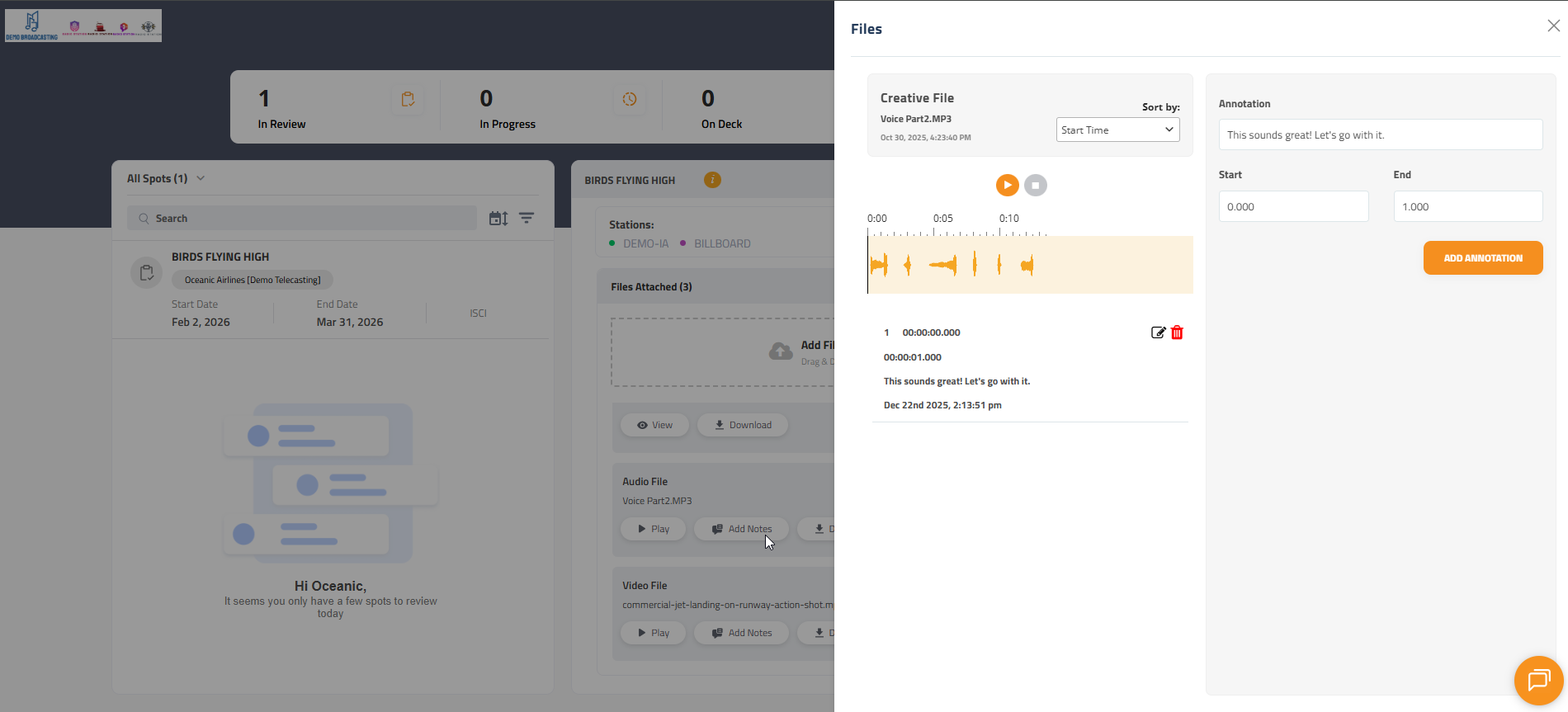 Any annotations made by the Advertiser will show in a talk bubble icon next to the file in the Production List view.