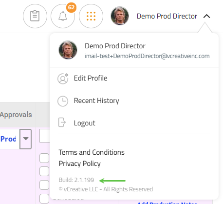 Click on the arrow in the upper right corner next to your name. The build number displays at the bottom of the dropdown