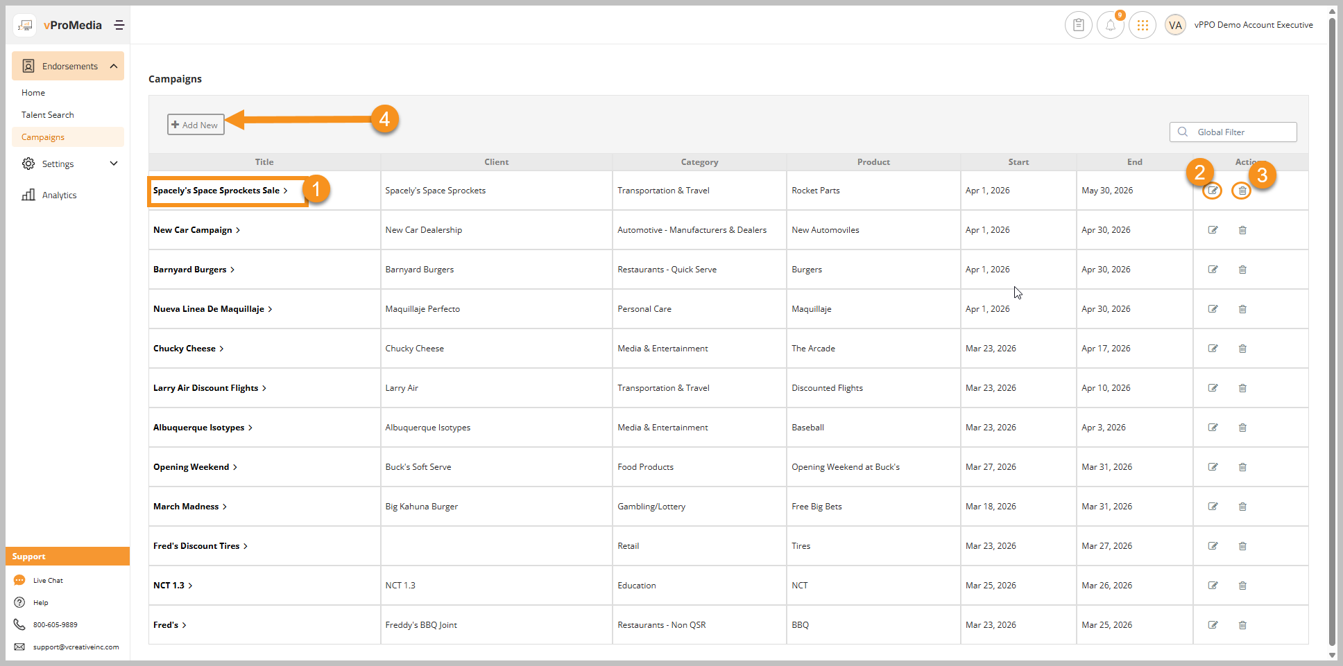 - Click the + Add New button to create a new Campaign and then add Talent