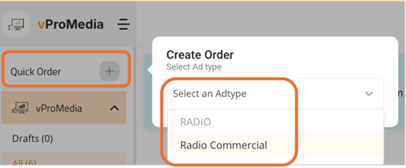 Choose your appropriate Ad Type to begin the entry of the production order.