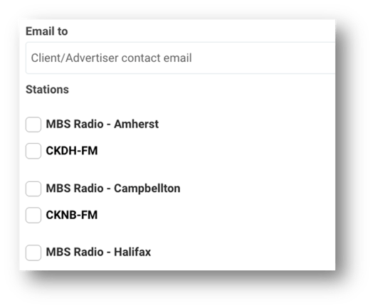 - Stations - Check the box next to each station this spot will need to air on, then enter the contract number. If you have multiple contracts, use a comma to separate the numbers. When selecting your Market Name, all stations will become selected.