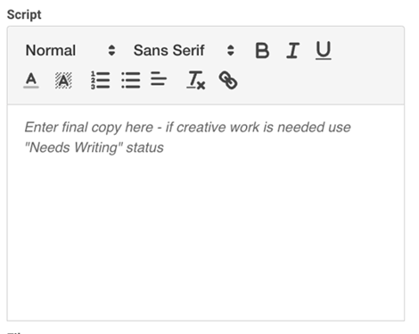 Script - This section is where Writers will enter script information . The script length is timed to allow confirmation that it matches your spot length. If the status is “Needs Writing” the script section will not be available.
