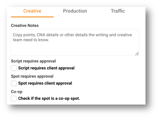 - Creative/Production/Traffic Notes - Enter any specific notes you might have for either production, traffic, or creative.
