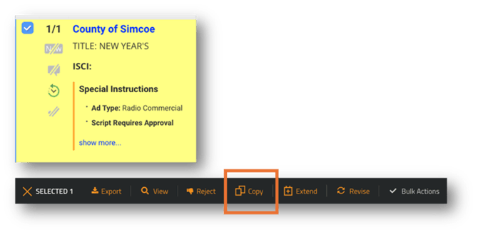 - Choose the PO to be copied by clicking the check box next to the advertiser name and click copy & select copy.