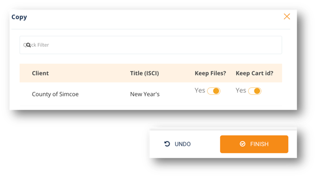 - Once the copy window opens, choose if you want to keep the files and/or the cart number and click After you click finish the new production order will open and you can make any necessary changes before you submit into workflow.