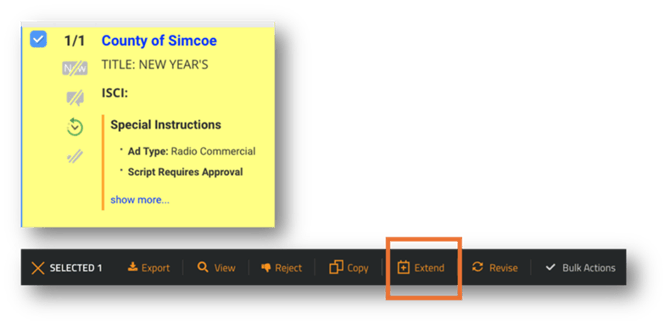 - Extend spots - Once you have located the PO you wish to extend, click the box next to the advertiser name and then click on the extend option on the Action Bar.