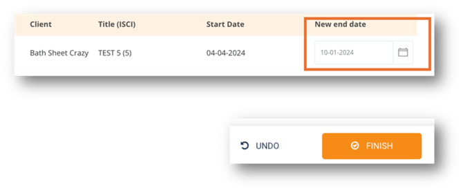 - Choose the new end date and click finish. This will move the spot into a status of extend dates and will alert the appropriate parties to make the changes in your traffic system and/or on air system.