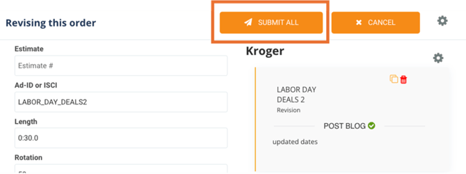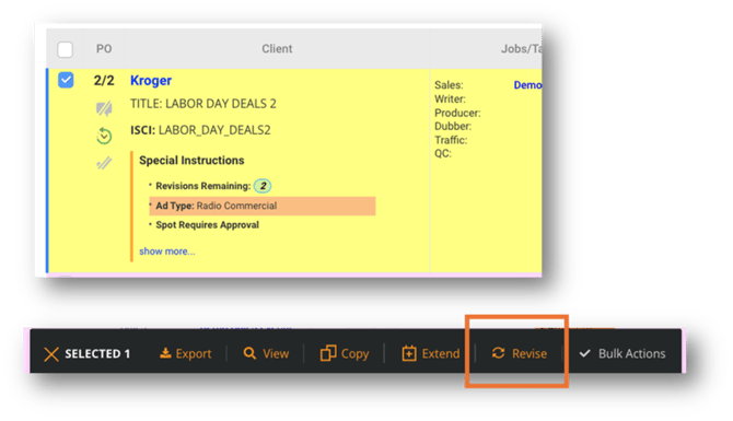 - Revise spots - Once you have located the PO you wish to revise, click the box next to the advertiser name and then click on the Revise option from the Action Menu.
