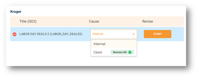 - Choose the reason; Internal or Client - The reason indicates if the revision is being initiated from the client or is an internal reason. Once you select the reason, you will then click start to begin the revision process.