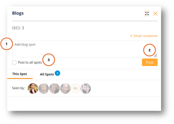 - Enter blog message - When the blog window opens enter the blog message and 2. click post. If the message needs to be posted to all spots, click 3. Post to all spots.