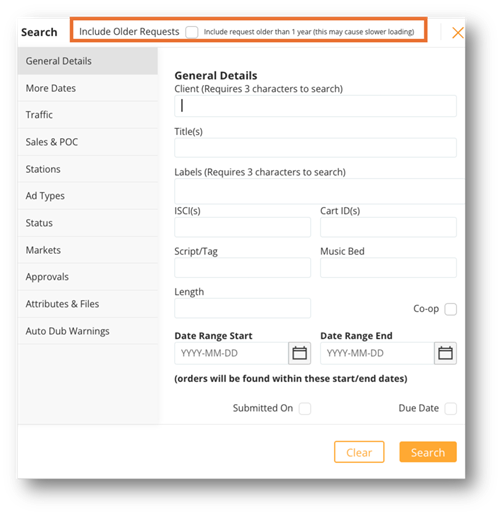 - Enter your search criteria - You have the ability to search by a multitude of fields. The more data you enter the more refined your search results will be. If you need to search for spots older than 13 months, click the Include Older Request Once you have entered your search data click search.
