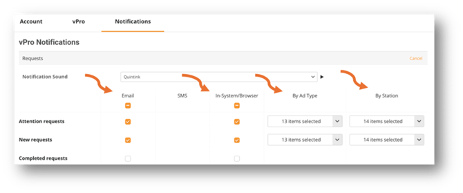 - Update your notifications - Once you access your profile, click on the Notifications tab and then scroll down until you see the section to update and then click on the edit icon on the far right of the screen to make changes. Once the edit window opens, you can select or deselect a given email or in system browser notification. The last two columns allow you to filter ad types or stations for which you receive notifications.