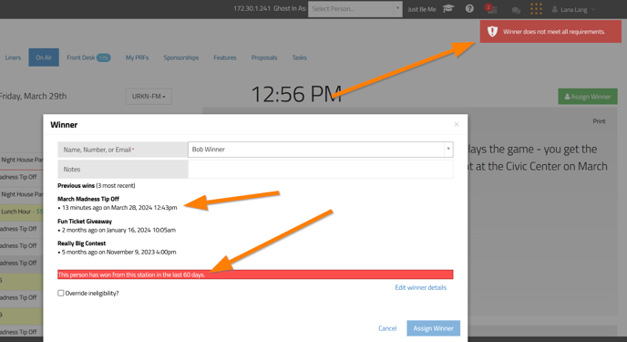 By default there will be a checkbox to Override ineligibility and assign the winner anyway, however that default feature can be turned off for your market if you prefer back in your Settings - Firm Tab - Firm Options (you must be a firm admin to access that option). Promotions Director, Program Director and General Manager ability users WILL still have the override option.