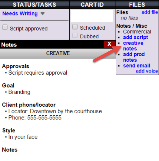 Creative Notes link will be available to show the creative details that were supplied.