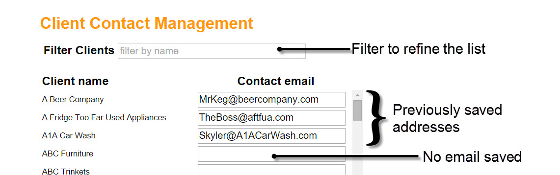 Client Emails appears for relevant users. AEs will only have access to their own client names/emails while managers will have the ability to see the full station client lists. This tool includes a filter for searching or limiting the view to keywords. The emails shown are saved, blanks fields are open for saving the proper email for that client you want to pre-load it. Multiple emails can be separated by a comma or a comma and a space.