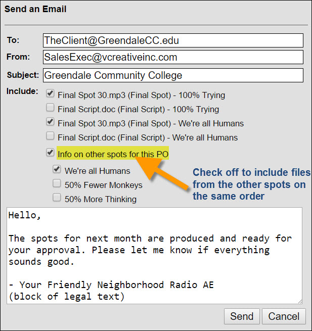 send email tool for orders on which multiple spots exist. This will then show check boxes for each spot on the order. Checking off the other Spot Titles/ISCI codes will then link thos spot's attached files to be included in the email being sent out.