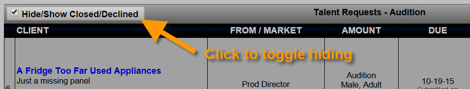 For managers who ask for Voice Parts to be done, the voice folders can be very busy with active voice requests as well as those that may not be as important. Now, there is the ability to filter out the voice requests that aren't currently active. This covers direct talent requests as well as Auditions and All Swims. The Voice Request folders; Active, Of My People, All Swim, Audition and Outbox all have a new checkbox at the top of the page. This check-box option is remembered between page loads and refreshes.