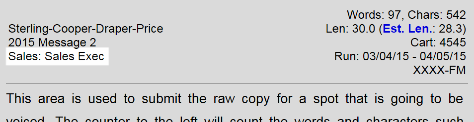 Raw copy submitted in PPO presents on an easy-to-read window when accessed from the "script" link in the Files column. This screen is formatted for printing (if you really have to) or for just reading off the screen. We have added the AE information to the formatting so that in addition to the other notes and information points, talent know which AE the spot is for.