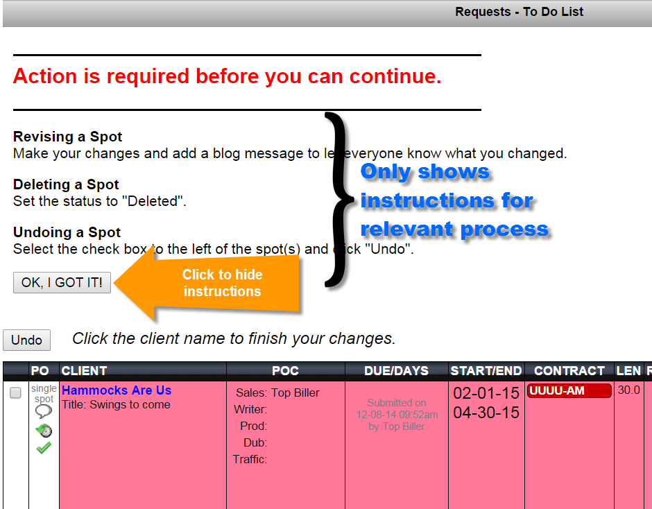 Any time a copy, extend or revision is started, users land on the "To Do" page. We have enhanced this page to give more concise instruction on only the spots that are up for said changes. To prevent confusion about navigation, we've hidden the left-hand navigation on the To Do page as well. Also, experienced users can opt to hide the detailed instructions and navigation with a button push. For a revision, we've also added "ghost text" to emphasize the required PO Blog post that is needed for every revision.