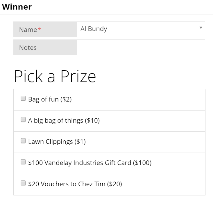 When the Winner is chosen and entered, the Pick A Prize choices will show below Winner Name and Notes. It will list each item in the Package with a checkbox to the left of it.