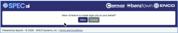 If you ALLOW, you have successfully created a connection between SPECai and vCreative and will not be prompted to log in again when moving from vPPO to SPECai.