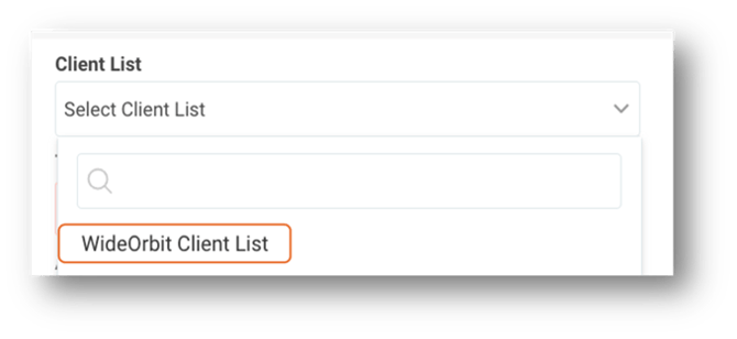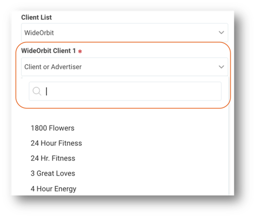 Step 2 - In the WideOrbit Client list drop down you can either begin to type in the name of the advertiser to select or you can scroll to locate.