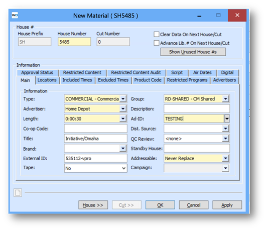 Step 4 - Once your Electronic Materials are on the screen, double-click to open. Review the materials information and click apply if you have made any changes, then click OK to finalize. After you select OK, Wide Orbit will send the house number/cart number back to vProMedia.