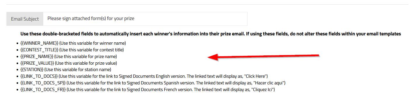 Once you choose a station you will see a pre made example template populate in the template box field. We have already done some of the work for you! You will see some bracketed options already populated inside the template. NOTE: don't make any changes to the characters inside the brackets, as these are hardcoded to function within the brackets. Another NOTE: remember to keep this template generic, as it will be used to go out to all the winners you send emails to and for all prizes on that station.