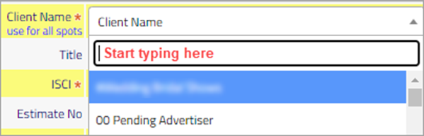 Client List:-The Client Name list in vPPO is synced to WideOrbit Traffic. It is now a combined type ahead, drop down list and displays the advertisers entered in WO Traffic. Use the search row to quickly find your Client by typing the first few letters of the Client name. As you type the full client list will appear and allow you to quickly filter to your client.
