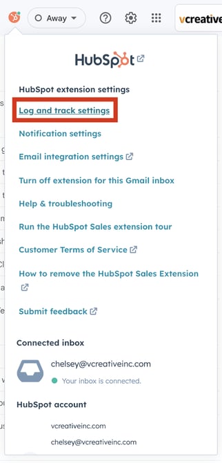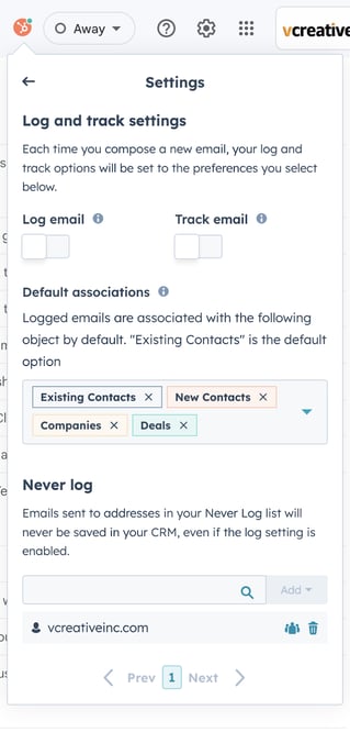 We recommend applying the default settings to TURN OFF logging, so you can manually select “log” when composing individual emails to customers for any conversations that you’d like to be captured in Hubspot. Please feel free to turn Track email ON, so you know if emails you send are being opened. This settings link is also where you can add any personal, family, or other email addresses that you never want Hubspot to log.