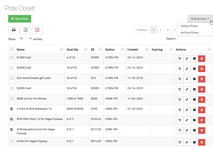 The Bulk Actions menu lets you delete multiple Prizes by checking the boxes to the left of each Prize and choosing Delete under Bulk Actions.