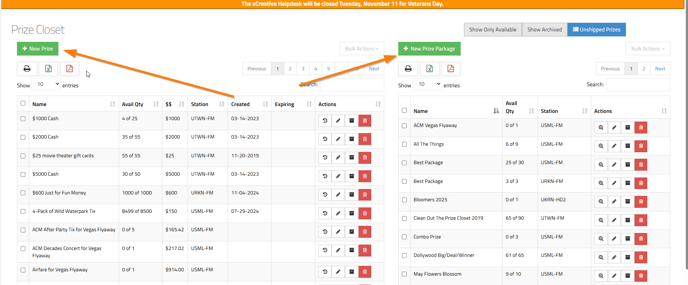 To create a New Prize Package, be sure that the Prizes for the Package are in the Prize Closet, and then click + New Prize Package.